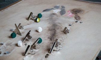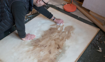 Les essences utilisées pour cette technique nommée “Essence sur papier” permettent de travailler, d’anticiper et de produire une expansion, une ventilation, une respiration là où il n’y aurait qu’un simple aplat. L’essence va en s’élargissant, elle se diffuse. Elle détend et soulage les tensions entre la forme et le fond.
